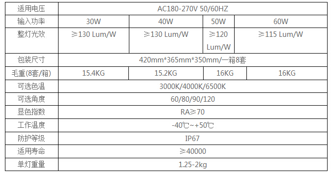 led泛光燈產品特點 1.COB陶瓷光源,4KV耐壓,防雷效果好 2.玻璃透鏡,可靠二次光學,抗黃變,無形變 3.全通透設計,縱向拉伸,對流效果好,散熱快 4.IP67防水等級,特殊氧化處理簡化燈具設計 5.多種配光方式,適合做工礦燈、投光燈、泛光燈、應用其廣泛 6.光效大于120Lum/W,符合能源之星標準,6000H光通維持率95.2% led泛光燈適用范圍: 廠房、車間、倉庫、廣場、廣告牌等等 led泛光燈安裝方式: 支架 吊桿 吊鏈;結構輕巧,安裝方便