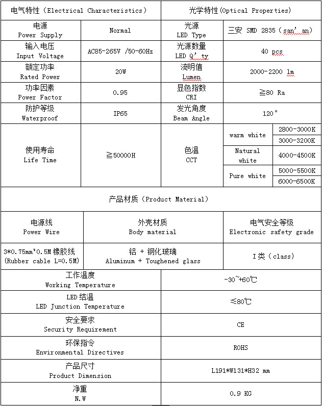PF73L-20W產(chǎn)品特點(diǎn)(Product features): 1.配合恒流率電源,顯色效果和亮度更出色; 2.了鋁基板面積,可以快速將熱量傳給殼體,增加了燈具的導(dǎo)熱效果 3.蓋咬合設(shè)計(jì)有效防止側(cè)邊漏光; 4.等級(jí)IP65 PF73L-20W產(chǎn)品規(guī)格(Product Spec):